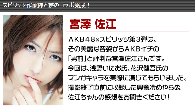 浅野いにお、高田サンコ、花沢健吾のイラストを、AKB48の宮澤佐江がグラビアで再現した。本日6月11日に発売された週刊ビッグコミックスピリッツ28号(小学館)の巻頭にカラー掲載されている。
