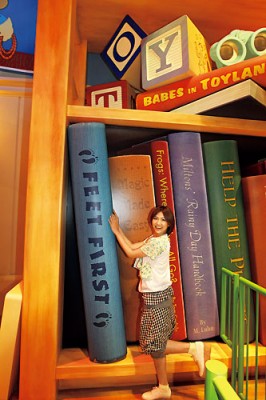 続いてウッディの口を通って施設内に入った彼女は、まるでおもちゃ箱をひっくり返したかのような広々とした空間に、再び大興奮! おもちゃの大砲やトランプタワー、巨大な塗り絵やドミノ、サイコロの山などを夢中で見て回っていたが、そのなかでも特に注目していたのが、通路沿いの壁に貼られたアトラクションの説明板だった。