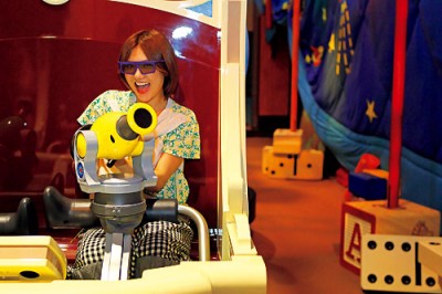 続いてウッディの口を通って施設内に入った彼女は、まるでおもちゃ箱をひっくり返したかのような広々とした空間に、再び大興奮! おもちゃの大砲やトランプタワー、巨大な塗り絵やドミノ、サイコロの山などを夢中で見て回っていたが、そのなかでも特に注目していたのが、通路沿いの壁に貼られたアトラクションの説明板だった。
