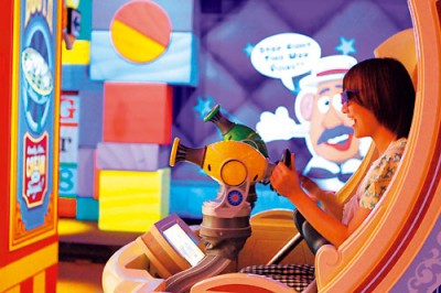 ちなみに「トイ・ストーリー・マニア!」は、シューター付きのトラムに乗り込んで、次々と飛び出してくる的を狙い撃ち、合計得点を競い合うという熱中度満点のアトラクション。最初に登場する練習用ステージでコツを掴んだ宮澤さんは、ゲームが始まるや怒涛の連射を披露! お皿を投げたり、飛んでいる風船を割ったり、輪投げをするステージなどをサクサクとこなし、初挑戦ながら14万点超えの好成績を記録した。